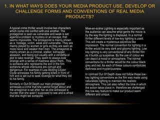 The document discusses conventions of thriller films and how Out of Depth challenges some of these conventions. It notes that typical thrillers use low-key lighting to create suspense, while Out of Depth uses naturalistic lighting to maintain realism. It also discusses typical character archetypes in thrillers - vulnerable protagonists and evil antagonists - and how Out of Depth follows these with a teenage girl protagonist and an unknown stalker/murderer as the antagonist. The document analyzes how Out of Depth uses camera techniques like point-of-view shots to build suspense, as well as opening with an inciting incident like many thrillers.
