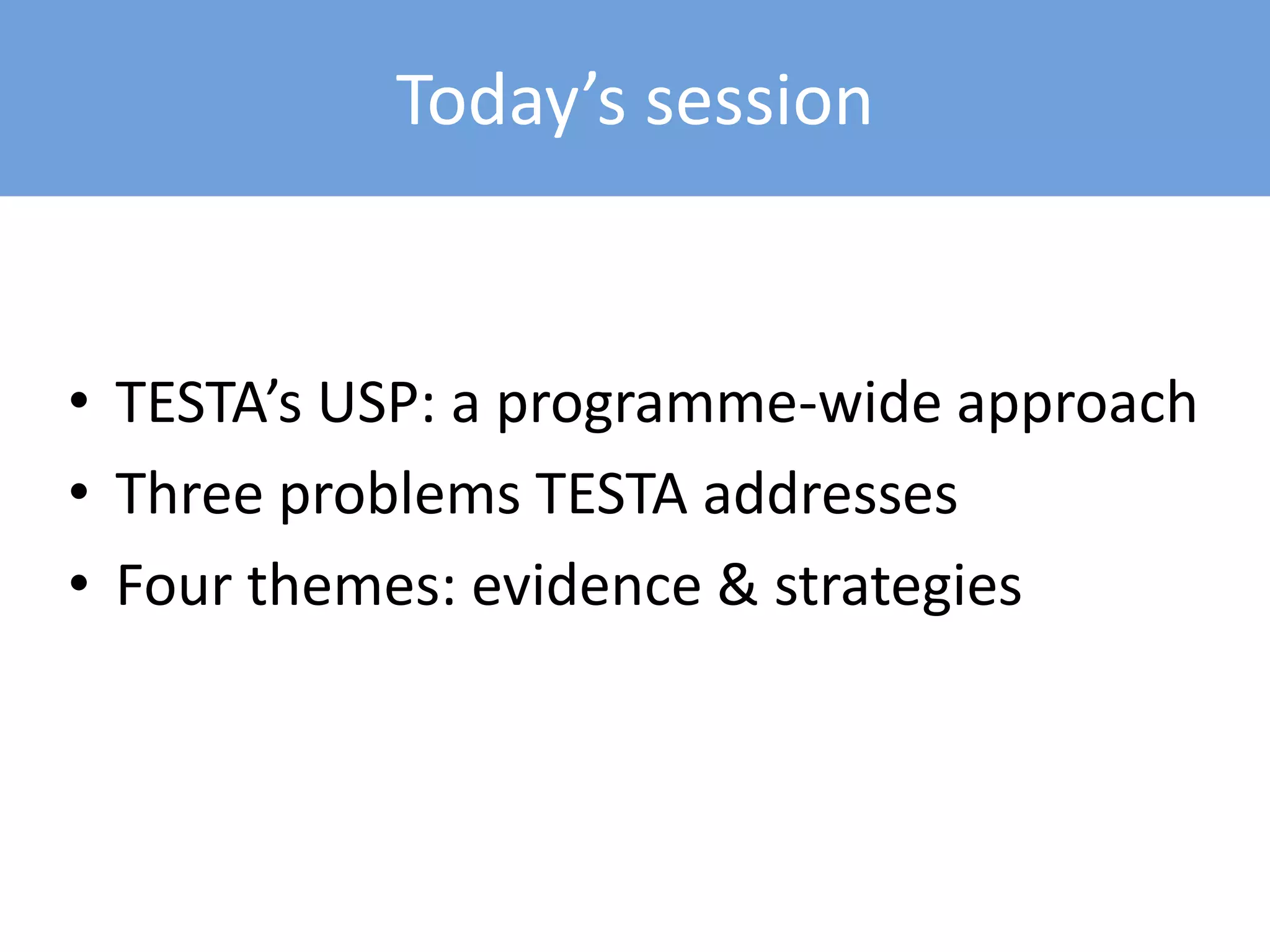 This document summarizes a presentation about TESTA (Transforming the Experience of Students Through Assessment), an assessment program that takes a holistic, program-wide approach. It addresses three common problems in assessment: variations in outcomes without understanding why, challenges with curriculum design, and difficulties with academic reading and writing. The presentation covered TESTA's evidence and strategies for improving assessment patterns, balancing formative and summative assessments, providing more connected feedback, and clarifying goals and standards to reduce student confusion.