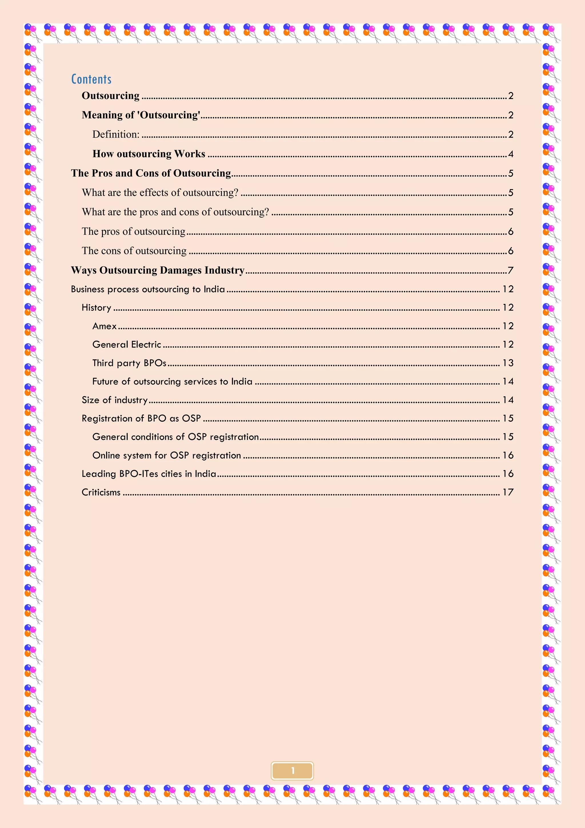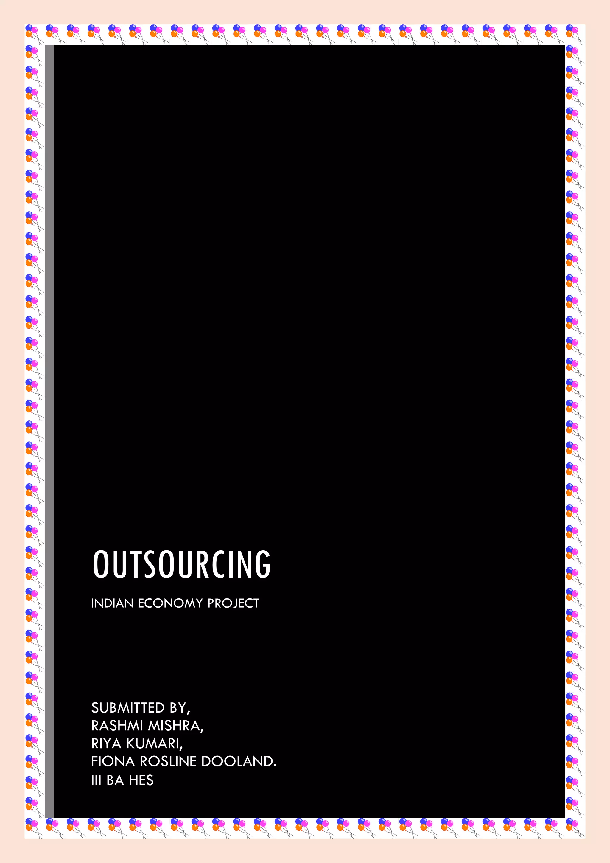 This document discusses business process outsourcing to India. It provides a brief history of outsourcing to India, mentioning early adopters like American Express and General Electric in the 1980s and 1990s. It also discusses the growth of third party BPO providers in India. The size and future growth of the Indian outsourcing industry is discussed, estimating it to be a $11 billion industry employing around 2.8 million people. Potential impacts of outsourcing on Indian society are also summarized such as job creation but also influence of foreign cultural values.