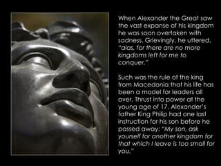 Alexander the Great was a legendary leader who conquered much of the known world by the time he was in his early 30s. However, upon seeing the vast expanse of his kingdom, he was overcome with sadness because there were no new lands left for him to conquer. Alexander established one of the largest empires in history and served as a model for leadership, teaching that great leaders are never satisfied and always seek new challenges and opportunities. The document discusses leadership lessons that can be learned from Alexander the Great's life and reign over 2,000 years later.