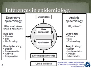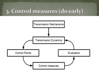 This document discusses hospital outbreak investigations. It defines endemic and epidemic infections in hospitals. Common source and propagated epidemics are described. Steps in investigating outbreaks in hospitals and communities are provided, including forming an investigation team, developing a case definition, conducting epidemiological and laboratory analyses. The goals of outbreak investigations are outlined. Methods for confirming and controlling outbreaks are discussed.