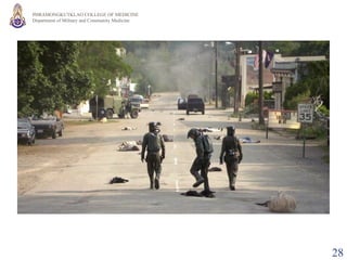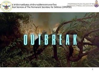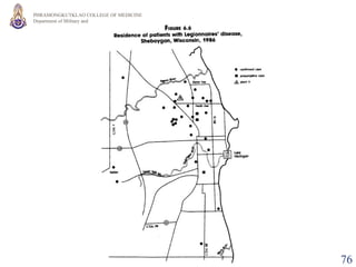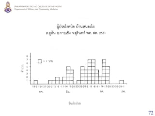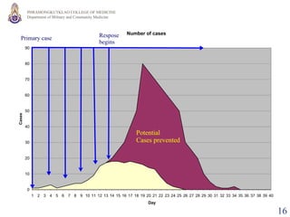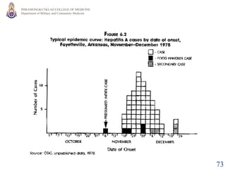 The document outlines the key principles and steps of conducting an outbreak investigation. It defines what constitutes an outbreak and explains that the purpose is to control the current outbreak, prevent future occurrences, and evaluate existing surveillance and prevention programs. The main steps described are confirming the outbreak, defining cases, collecting descriptive data, developing hypotheses, testing hypotheses through analytical studies, communicating conclusions, and recommending control measures.