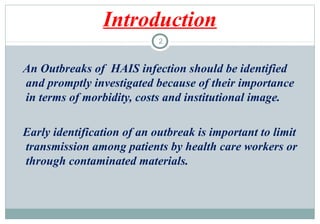 The document outlines guidelines for managing healthcare-associated infection (HAIs) outbreaks, emphasizing early detection and investigation to mitigate transmission among patients. It details steps for outbreak investigation, including verifying diagnoses, characterizing cases, and implementing control measures, while assigning roles and responsibilities to involved personnel. A thorough final report is essential to summarize the findings and recommendations to prevent future occurrences.