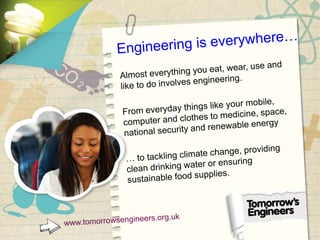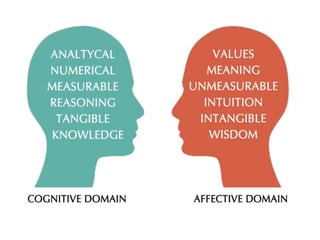 This document discusses implementing outcome-based education for engineering programs. It outlines the need to shift focus from traditional teaching to clearly measuring student learning outcomes in order to develop global engineers. Key aspects of outcome-based education include defining the program's vision, mission, objectives and outcomes related to knowledge, skills, attitudes and competencies. Bloom's taxonomy is referenced for categorizing cognitive and affective learning domains. The goal is to prepare students who can solve unknown future problems by strongly understanding fundamentals, acquiring new skills, and developing abilities to adapt to workplace changes.