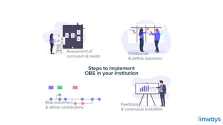 Outcome-Based Education (OBE) focuses on defined learner outcomes and continuous assessment to ensure educational goals are met, accommodating diverse learning styles. Implementation of OBE involves assessing needs, defining outcomes, collaboration among stakeholders, and continuous evaluation to guarantee achievement of educational standards. In India, OBE is endorsed by the National Board of Accreditation and the National Assessment and Accreditation Council to improve higher education quality.