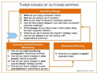1. The document describes a role play game used to illustrate the principles of Outcome Mapping, which was conducted at a workshop in Bangladesh.