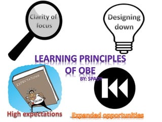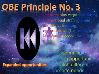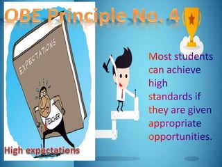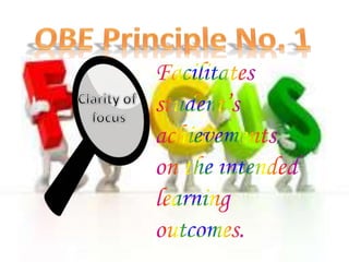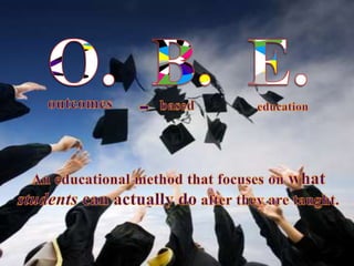The document critiques traditional education assessments, advocating for outcome-based education (OBE) as a holistic, student-centered approach focused on achieving defined learning outcomes. It outlines the importance of understanding these outcomes in planning and teaching, emphasizing that OBE prioritizes student mastery and prepares them for future life roles. The text also discusses effective teaching strategies and assessment principles that support individualized learning and student engagement.