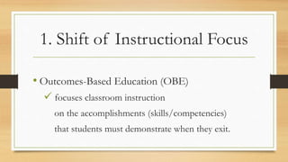 Outcomes-Based Education (OBE) emphasizes instructional focus on the skills and competencies students must demonstrate upon graduation, including immediate and deferred outcomes assessed through defined program objectives and student learning outcomes. The document outlines the curriculum mapping process to align courses with desired outcomes and the characteristics and tools of outcomes-based assessment. It advocates for tangible educational assessments that simulate real-life tasks to effectively evaluate student proficiency and promote holistic development.