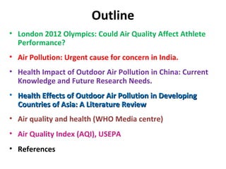 The document discusses the health impacts of outdoor air pollution in multiple locations. It describes how air pollution can negatively affect athlete performance at the 2012 London Olympics. It also discusses high air pollution levels and related health issues in India and China, including increased respiratory infections and links to cancer. The World Health Organization guidelines for air quality are introduced.