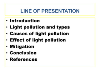Outdoor light pollution is caused by excessive and improper use of artificial lighting. It has negative impacts on human health, wildlife, and the environment. Light pollution can be reduced through improved lighting fixtures that direct light downward, using full-cut off street lights, installing occupancy sensors, and choosing light sources like sodium lamps that are more efficient and emit light at specific wavelengths. Proper lighting design and maintenance practices are needed to mitigate light pollution and its effects.
