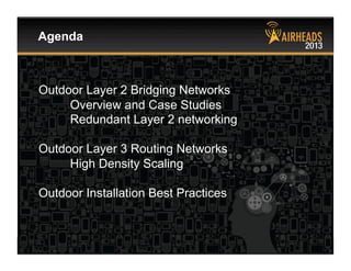 This document summarizes an Aruba Networks presentation on outdoor wireless networking. It discusses using Aruba's outdoor APs and mesh routers to implement layer 2 bridging and layer 3 routing networks for campus extensions, municipal networks, and industrial applications. Specific case studies are presented on using outdoor bridging to provide wireless access for portable classrooms and courtyards on a school campus. Best practices are covered for capacity planning, installation, and ensuring high availability in outdoor wireless networks.