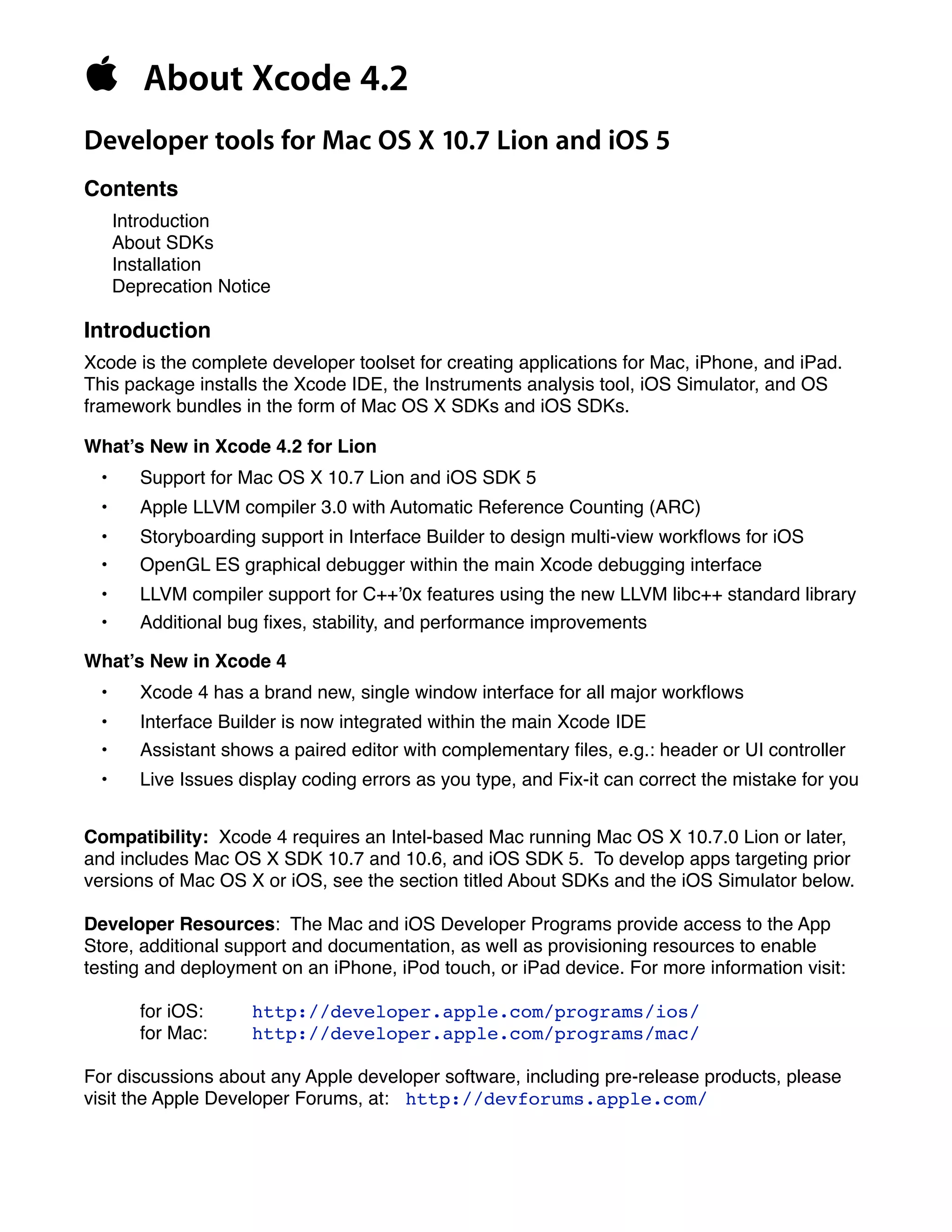 - Xcode 4.2 supports Mac OS X 10.7 Lion and iOS SDK 5. It includes a new single window interface, integrated Interface Builder, and improved debugging tools.