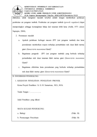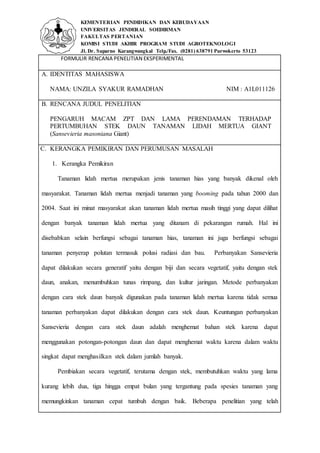 Dokumen ini adalah rencana penelitian oleh mahasiswa Unzila Syakur Ramadhan tentang pengaruh berbagai macam zat pengatur tumbuh (ZPT) dan lama perendaman terhadap pertumbuhan stek daun tanaman lidah mertua giant (Sansevieria masoniana giant). Tujuan penelitian meliputi mengetahui efektivitas ZPT dan lama perendaman dalam meningkatkan keberhasilan dan pertumbuhan stek daun. Metodologi penelitian dilakukan di screen house Fakultas Pertanian dengan rancangan acak kelompok dan variabel yang diamati termasuk pertumbuhan tunas dan berat kering tanaman.