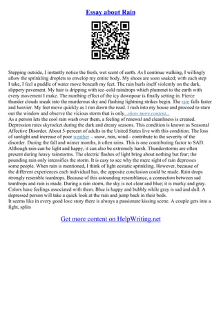 The document describes the experience of walking in the rain and how different people can perceive rain differently. It summarizes that some may find the cool rain refreshing while others associate rain with sadness and depression. Seasonal affective disorder rates rise in darker, wetter seasons. While some see light rain as happy, others see heavy rainstorms as frightening due to thunder, lightning and intensified rain. The gray, murky sky during rainstorms can also contribute to sad moods.