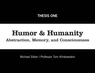 This thesis explores the hypothesis that humor arises from the combination of abstract thought, memory, and self-aware consciousness. It argues that humor involves sophisticated cognitive skills and can promote new ways of thinking about complex concepts. As computer memory and digital information continue to grow rapidly, there may be greater potential to discover unexpected connections between disparate pieces of information, leading to new understandings and avenues for humor. The document also briefly outlines existing philosophical approaches to humor as involving incongruity, superiority, relief, or play.
