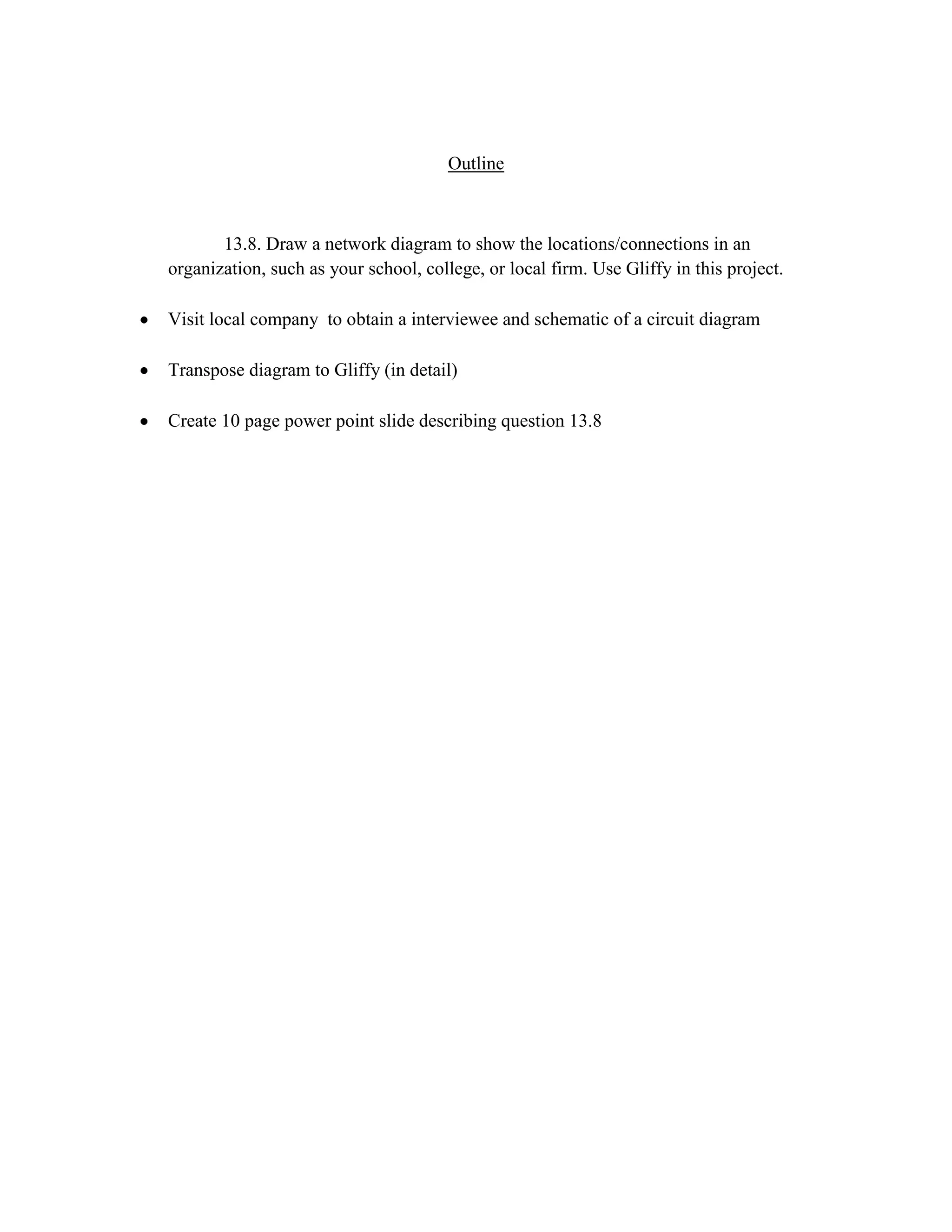 The document outlines steps to draw a network diagram of a school, college or local firm using Gliffy software. It instructs the reader to visit a local company to interview someone and obtain a schematic diagram, then transpose the diagram into Gliffy in detail and create a 10 page PowerPoint slide describing drawing the network diagram.