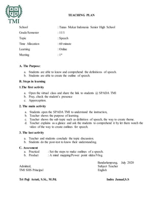 The document outlines a teaching plan over 4 meetings to teach 11th grade students about speech. It includes the purpose of each meeting which is to understand definitions of speech, create an outline and title, comprehend the purpose, and learn about different kinds of speech. Each meeting follows similar steps - opening, main activity of explanation by teacher, and conclusion. Assessment includes practical and product assignments like creating an outline, title, presentation on purpose, or recording a speech. The plan aims to help students learn key concepts of speech over 4 online sessions.