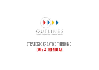 This document outlines the strategic creative thinking services of Outlines, including CBLs (Creative Brainstorming Labs) and Trendlab. CBLs bring together panels of participants from varied backgrounds to provide original ideas and solutions through a guided creative process. Trendlab is an international observatory that shares concept stimuli with a global network to identify emerging consumer trends from diverse perspectives around the world. Both services aim to generate innovative solutions through collaborative creative thinking.