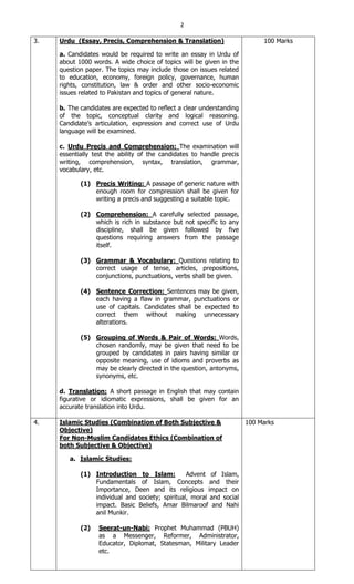 This document outlines the compulsory subjects and structure of the examination for the Punjab Public Service Commission (PPSC) in Pakistan. It details 6 papers that will be part of the examination: 1) English Essay, 2) English Language, 3) Urdu Language, 4) Islamic Studies/Ethics, 5) Pakistan Studies, and 6) General Knowledge. Each paper is worth 100 marks and will test the candidates' language proficiency, comprehension, translation skills, and knowledge of the subject through both subjective and objective questions. The papers aim to evaluate the candidates' conceptual understanding and logical reasoning abilities.