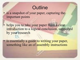 The document provides guidance on outlining for writing papers. It discusses that an outline is a snapshot of the paper that helps organize points from the introduction to conclusion in a logical manner. The document offers tips for writing outlines such as arranging information logically with an introduction, main body, and conclusion. It also notes that outlines should be concise and avoid having only one point or sub-point. Sample outlines are included to demonstrate both topic and sentence outline structures.