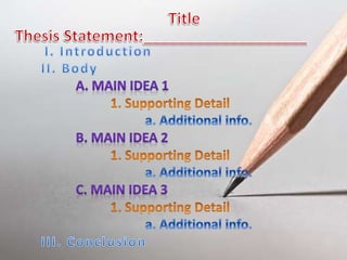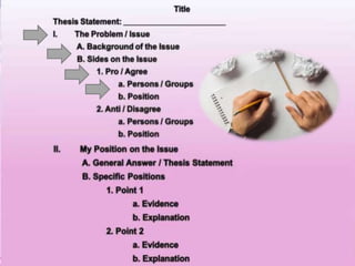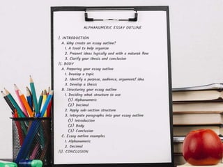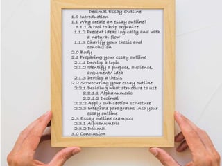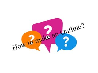 This document discusses outlines and their importance. It defines an outline as a written plan that serves as a skeleton for paragraphs or a summary of essential information. Outlines give an overview of topics and show how subtopics relate. They are useful for organizing ideas before writing and analyzing papers. There are two main types of outlines - writing outlines made before writing and reading outlines made when studying papers. Outlines also have different notation systems like decimal or alphanumeric and use indentation. Formal outlines for submission use topic or sentence outlines. The document provides an example of a sentence outline for an essay about moving on from a past relationship.