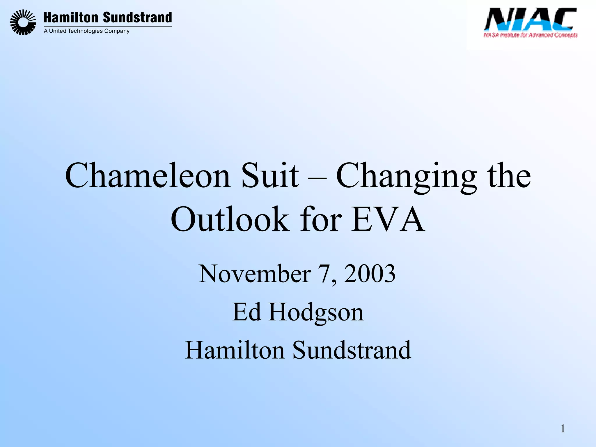 The document discusses the concept of a "Chameleon Suit" that aims to revolutionize extra-vehicular activity (EVA) systems through an integrated, multi-functional design approach. It outlines some of the key challenges with current EVA systems and opportunities emerging technologies provide to address issues like mobility, thermal control, life support and energy needs. The concept integrates functions like thermal regulation, gas transport and power generation directly into the suit material through the use of advanced materials like conductive polymers, shape memory alloys and thin film devices. While challenges remain around issues like artificial photosynthesis integration, the document argues the required technologies are advancing and a fully-integrated, lightweight suit that improves upon current systems is achievable.