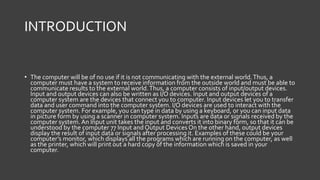 Input and output devices allow a computer to communicate with the external world by receiving and transmitting data. Input devices such as keyboards, mice, and scanners transfer data into the computer, while output devices like monitors, printers, and speakers share the results of processed data. There are two main types of input devices - manual devices that are operated by hand, and direct data entry devices that can quickly input large amounts of data automatically. Common output devices display visual information on screens or print hard copies. The monitor is a crucial output device that shows users pictures, videos, and graphics on its screen.