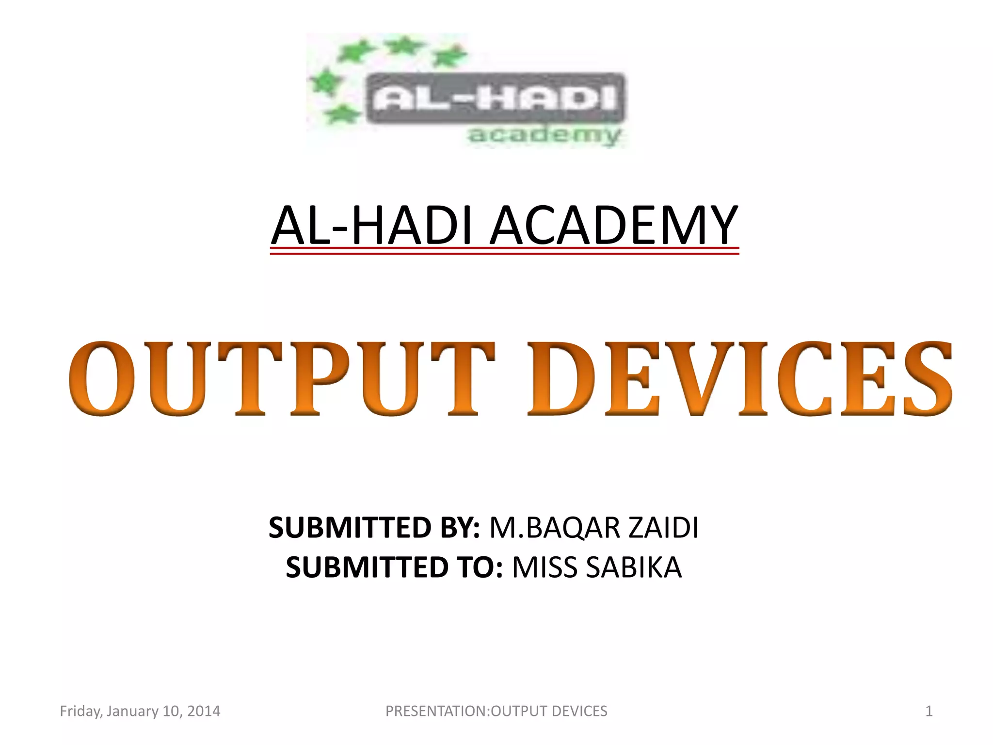This document is a presentation on output devices submitted by M. Baqar Zaidi to Miss Sabika. It defines output devices as any device that outputs information from a computer. It discusses various types of output devices including monitors, printers, plotters, speakers, fax machines, internet telephony, and multifunctional devices. For each type of output device, it provides detailed definitions and examples of specific models like CRT monitors, LCD monitors, laser printers, inkjet printers, and dot matrix printers.