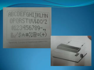 An output device accepts data from a computer and translates it into a form suitable for the outside world. There are two main types of output: soft copy, which is temporary, and hard copy, which is permanent and printed onto paper or other material. Printers are commonly used today to produce hard copy output. Dot matrix printers print one character at a time using pins that strike an ink ribbon to form dots, while inkjet printers spray small ink drops to form characters and images at high resolution but slower speeds. Laser printers use a laser beam to fuse tiny ink particles onto paper for very high quality output.