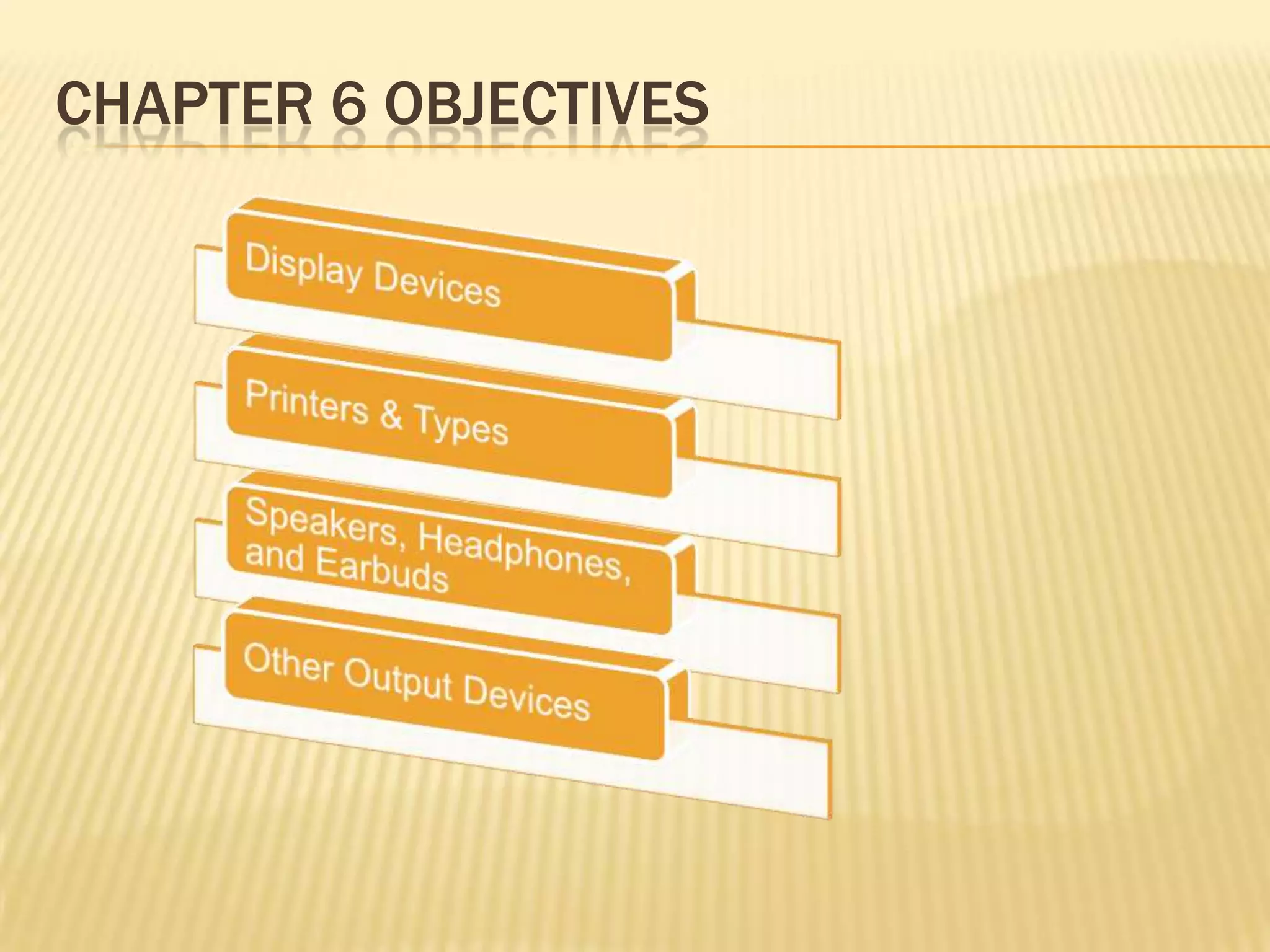 Output devices convey processed data to users. Display devices like LCD and plasma monitors visually output text, graphics, and video. Printers produce hard copies on paper through inkjet, laser, or other methods. Audio output devices like speakers and headphones allow users to hear processed sound files. A variety of other specialized output hardware exists as well, such as data projectors, interactive whiteboards, and fax machines.