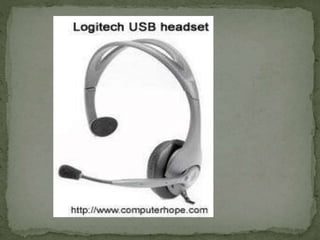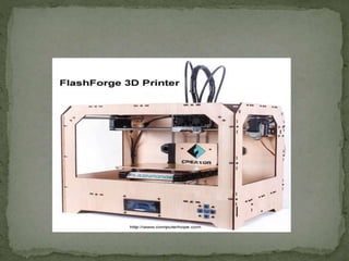 3D printers, which create physical objects from digital models using materials like metal or plastic; braille readers, which convert text to raised dots for blind users to read; headphones, which allow private listening of audio without disturbing others; speech-generating devices, which help those with speech impairments communicate; and plotters, which draw continuous vector graphics rather than dots like traditional printers. The document provides examples of how these various output devices are used.