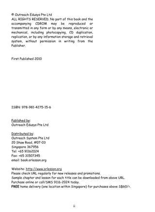 This document is an excerpt from a book titled "Primary 4 Mathematics Ace the Exam with My 24/7 Personal Tutor" which contains 10 practice exam papers for the Primary 4 mathematics exam in Singapore. It includes detailed explanations for all questions provided on a multimedia CD by a tutor. The book and online resources are aimed at helping students prepare for their Primary 4 mathematics exams.