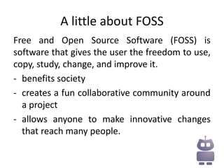The Outreach Program for Women (OPW) is an internship program that aims to increase participation of women in free and open source software projects by matching interns with mentorship opportunities in organizations like Fedora, GNOME, Mozilla, and others; interns will work remotely while collaborating with mentors and project teams through communication methods like IRC, email, and bug trackers. The goal of OPW is to welcome more women into the inclusive FOSS community and guide early contributions.