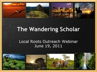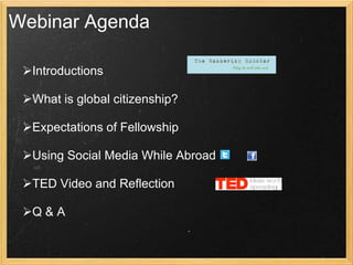 This document outlines an agenda and information for a webinar hosted by Local Roots Outreach for their fellowship program. The webinar covers expectations for fellows to share their experiences abroad on social media, tips for using platforms like Twitter and Facebook while traveling, and introduces staff and participating fellows. It also previews a TED talk on cultural perspectives that will be discussed.