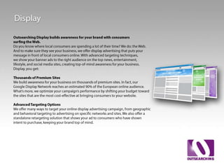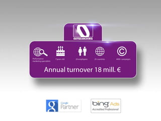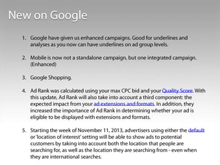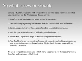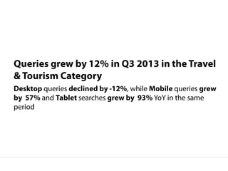 The document contains data on auction metrics and search trends for travel and tourism across different devices (all devices, desktop, mobile, tablet). It shows metrics like query volume year-over-year growth, impressions growth, click growth, average cost-per-click for Q3 2013 and 2012. It also shows the shifting share of queries by device from 2012 to 2013. Additional facts on traveler behavior and online activities are provided at the end.