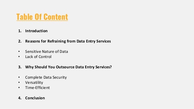 The document discusses the considerations organizations face when deciding between in-house and outsourced data entry services. It outlines the reasons companies may hesitate to outsource, such as data sensitivity and lack of control, while also highlighting the benefits of outsourcing, including complete data security, flexibility, and time efficiency. Ultimately, it emphasizes that collaborating with a data entry services company can optimize costs and enhance operational efficiencies without compromising data integrity.
