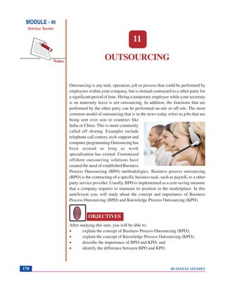 This document discusses outsourcing and knowledge process outsourcing (KPO). It defines outsourcing as contracting work to an outside party rather than using internal employees. Business process outsourcing (BPO) is defined as outsourcing business functions like payroll or customer service. KPO involves outsourcing knowledge-intensive work requiring specialized expertise, like legal or financial services. The document outlines advantages of BPO and KPO, including cost reductions, focusing on the core business, and accessing outside expertise.