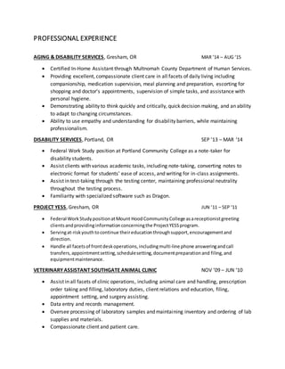This document is an executive summary and resume for Audra Reed that highlights their experience in event planning, staff management, community advocacy, and clerical work. Audra has over 5 years of experience managing staff and multiple areas of operation simultaneously. They are skilled in all aspects of event coordination and have a passion for community involvement and advocacy, especially for disability and marginalized groups. Audra's professional experiences include positions in aging and disability services, disability services at Portland Community College, and various roles in veterinary clinics.