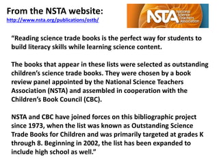 The document discusses outstanding science trade books for K-12 students, emphasizing their role in enhancing literacy skills while teaching science content. These books are selected by a review panel from the National Science Teachers Association in collaboration with the Children’s Book Council, with historical roots dating back to 1973. Recent expansions now include high school books, thereby broadening the previous K-8 focus.