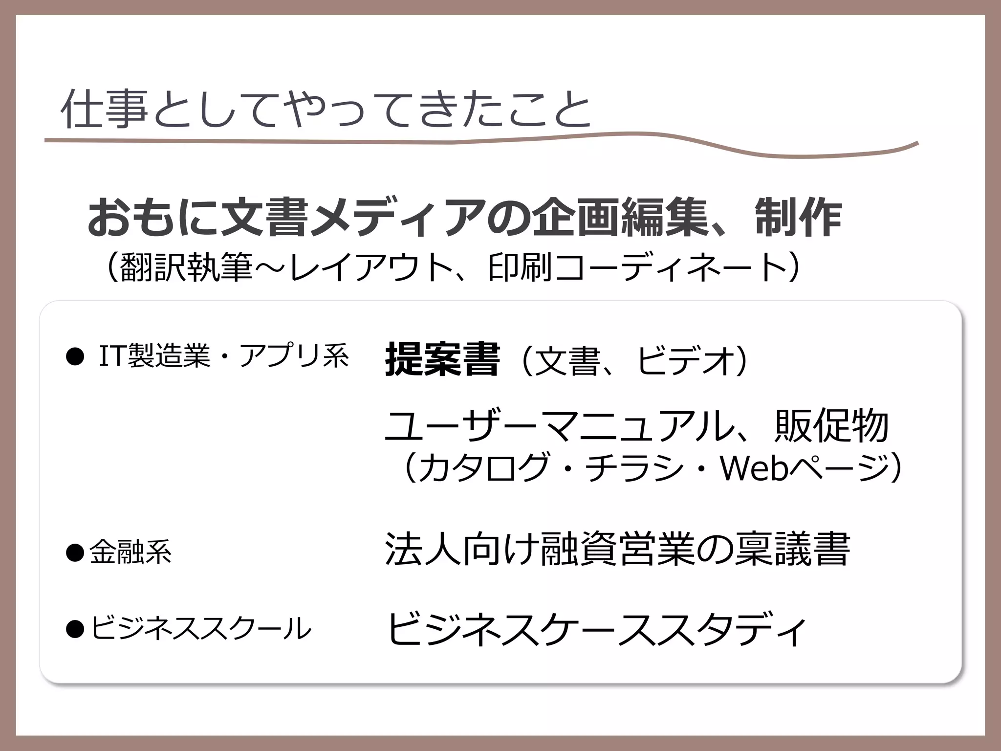 仕事としてやってきたこと おもに⽂文書メディアの企画編集、制作 (翻訳執筆〜~レイアウト、印刷コーディネート) ● IT製造業・アプリ系 提案書(⽂文書、ビデオ) ユーザーマニュアル、販促物 (カタログ・チラシ・Webページ) ●⾦金金融系 法⼈人向け融資営業の稟議書 ●ビジネススクール ビジネスケーススタディ Copyright