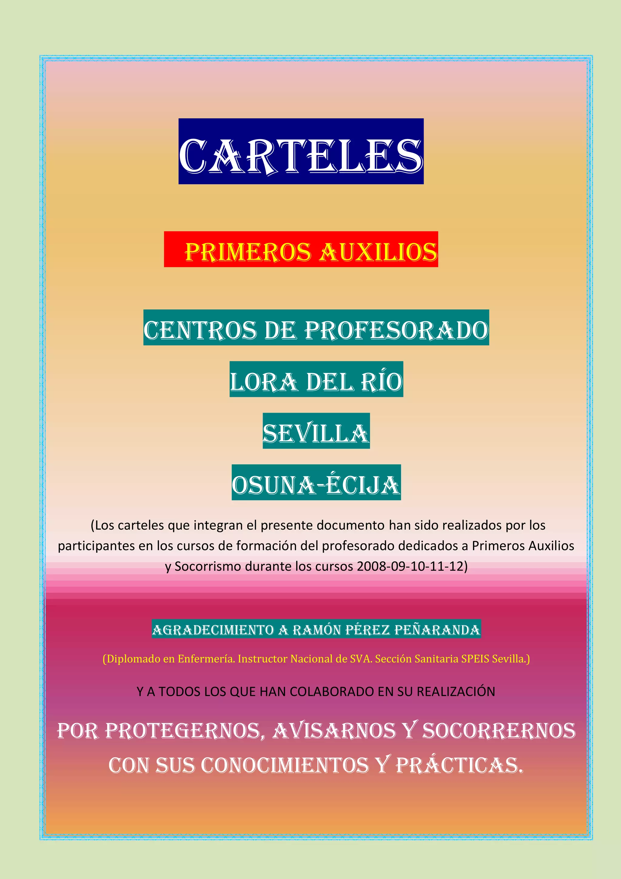 Este documento presenta varios carteles sobre primeros auxilios relacionados con asfixia y atragantamientos. Fue realizado por participantes en cursos de formación de profesorado sobre primeros auxilios y socorrismo entre 2008-2012. Agradece al instructor Ramón Pérez Peñaranda y a todos los que colaboraron. Incluye información sobre obstrucción de la vía aérea, atragantamientos y la maniobra de Heimlich para tratar una obstrucción grave en un paciente consciente.