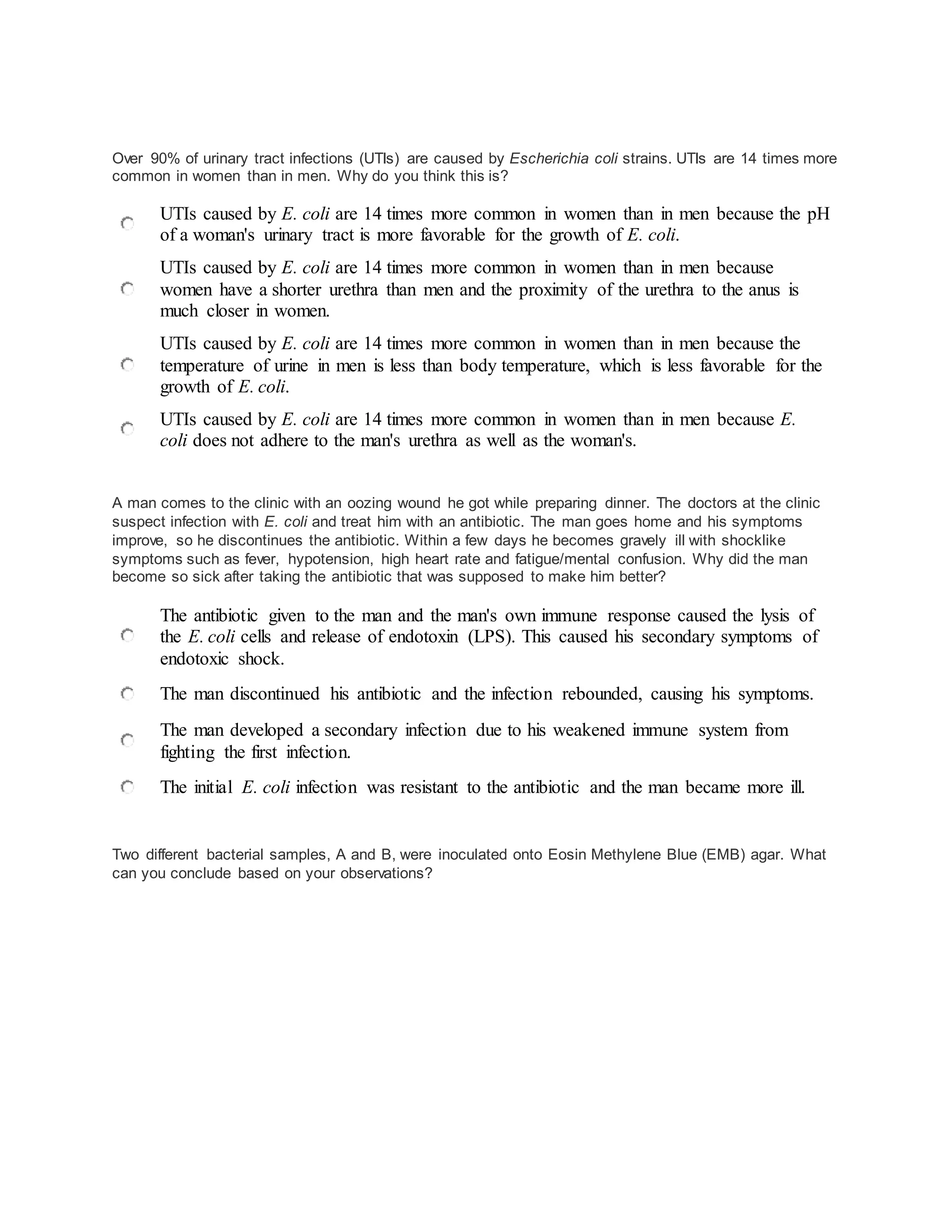 The document discusses urinary tract infections (UTIs) caused by Escherichia coli, which are much more common in women than men. It provides several potential reasons for this, including that the pH and temperature of a woman's urinary tract is more favorable for E. coli growth, women have a shorter urethra closer to the anus, and E. coli adheres better to the woman's urethra.