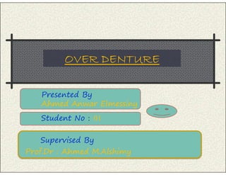 This document provides an overview of over dentures, including: