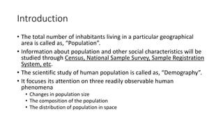 The document discusses population problems in India and measures to address overpopulation. It begins by defining key demographic terms and explaining that demography is the scientific study of human populations. It then outlines causes of population growth in India such as improvements in healthcare and food production. Major consequences of overpopulation are described like pressure on land resources, food and housing shortages, unemployment, and environmental changes. The document concludes by summarizing new approaches to control population like decentralized planning and state-specific strategies, as well as measures like increasing the marriage age and women's status, education, and involvement of non-governmental organizations.