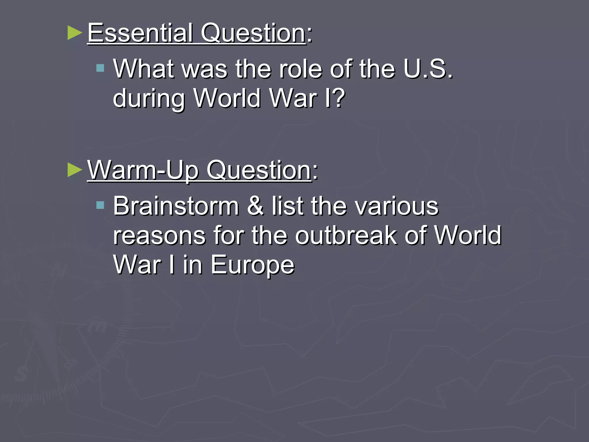 The document discusses the role of the U.S. during World War I. Initially, President Wilson proclaimed neutrality. However, Germany's unrestricted submarine warfare threatened U.S. trade and lives. The intercepted Zimmerman Telegram also increased tensions. In April 1917, Wilson asked Congress to declare war to "make the world safe for democracy." The U.S. mobilized troops and supplies to support the Allies, who were struggling by 1918. American involvement helped shift the war in favor of the Allies, and Germany surrendered in November 1918.