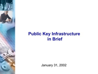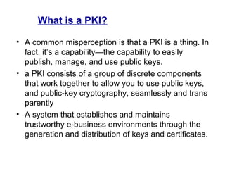 Public Key Infrastructure (PKI) allows for trusted electronic business by establishing trust through the generation and distribution of public keys and certificates. A PKI consists of components that work together to publish, manage, and use public keys seamlessly. It provides capabilities for authentication, authorization, confidentiality, integrity, non-repudiation, and audit controls through the use of public key cryptography and digital signatures. The PKI market has grown significantly since the late 1990s as PKI enables new e-business processes and transactions. Common cryptographic algorithms used in PKI include symmetric algorithms like DES and public key algorithms like RSA.