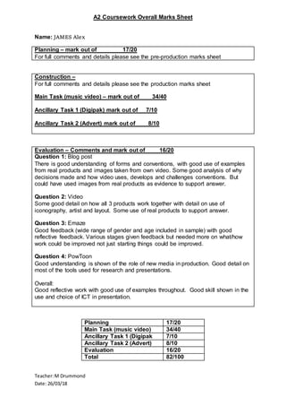 This document contains a student's marks sheet for an A2 coursework. The student, James Alex, received 17 out of 20 for planning, 34 out of 40 for their main music video task, 7 out of 10 for their Digipak ancillary task, and 8 out of 10 for their advert ancillary task. Their evaluation received 16 out of 20. In total, the student received 82 out of 100 marks.