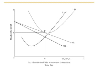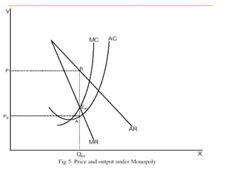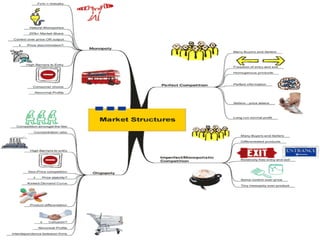 The document discusses different market structures and pricing under each structure. It covers the four main market structures: perfect competition, monopoly, monopolistic competition, and oligopoly. For each structure, it describes characteristics like number of firms, entry barriers, product differentiation. It then discusses pricing determination. Under perfect competition, firms are price takers and price equals marginal cost. Under monopoly, the single firm influences price by adjusting output to where marginal revenue equals marginal cost. Under monopolistic competition, in the short run firms maximize profits where marginal revenue equals marginal cost, and in the long run price equals average cost.