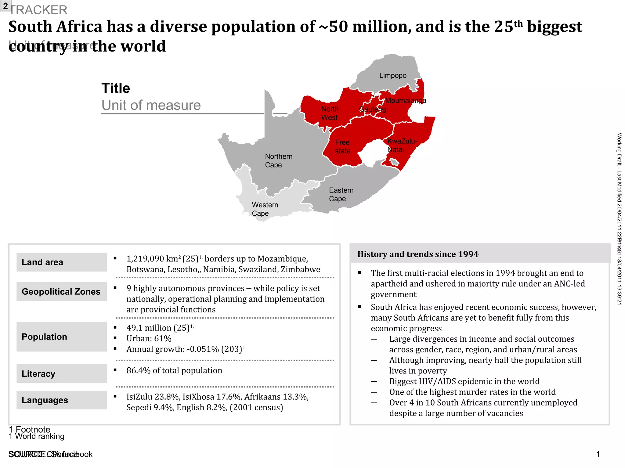 South Africa has a population of around 50 million people and has 9 provinces. While national policies are set, provinces have autonomy in implementation. South Africa has experienced economic growth in recent decades but there are still high levels of inequality. Nearly half the population lives in poverty and unemployment remains high at over 40%. South Africa also has the largest HIV/AIDS epidemic in the world and high crime rates.