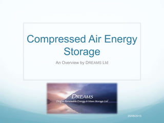 Compressed air energy storage is a method for storing renewable energy by compressing air and storing it in underground caverns or above ground tanks. The document discusses several existing CAES plants including Huntorf, Germany (1978) and McIntosh, Alabama (1992). It also outlines several proposed CAES projects in locations such as Texas, Ireland, Ohio, and California. CAES provides advantages such as quick start-up times, shifting cheap off-peak energy to expensive peak times, and utilizing excess renewable energy that would otherwise be wasted.